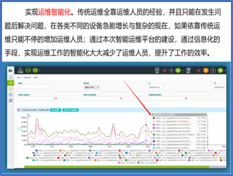 产品特点: 监测指标:包括对设备存活检测、Ping监控、CPU利用率、内存利用率、设备运行时间、端口状态、端口流量、新日志监控、crc校验、错包、丢包等。 专线链路状态监控:自动登录专线接入路由器执行远程ping测指令,检查链路丢包,时延,带宽利用率。真实反映用户专线网络质量。 专线质量告警:配置自动备份、平台每天自动在设备上执行show run /dis cu等配置查看命令,并将配置进行备份,支持配置变化对比。 报警功能:系统能够设定预警阈值,一旦监测到异常情况,系统会发出警报通知运维人员。 智能调节:系统可以根据网络设备的参数和需求调节设备能耗、温度等,提供良好的设备运行环境。 节能环保:系统可以根据设备的使用情况智能控制设备的电力消耗,节约能源并减少碳排放。 数据安全:系统具有严格的数据加密和权限管理机制,确保病人数据的安全和隐私保护。