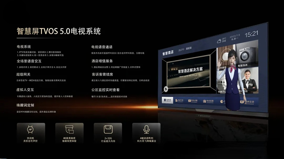 产品特点: 节能功能:背景音乐、客房消防警报、预约退房。 增值功能:在线续房、自营商城、滚动字幕、广告发布系统、关怀式营销。 提升入住体验功能:全语音控制、电视直播(IPTV)、影视点播、私密投屏、支持方言、客需服务、客诉拦截、多轮对话功能、小秘书服务、监控流对接功能、预约退房、自定义问答、音乐播放、闲聊功能、蓝牙音乐、模式联动智慧屏、告警系统。 提升酒店管理功能:预约退房、自定义问答、告警系统。 品牌形象:酒店介绍、开机视频、开机欢迎词、支持多套UI。